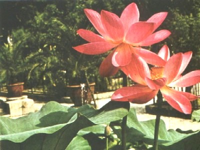 Lotus. Origin: Asia; introduced into Europe in 1787. White, deep red, purplish and pind varieties exist, also many doubles. Used for indoor pools in temperate climates or outside tanks in Summer. The plant has been held sacred in India and China from very early times. The Buddhists see the Lotus as a symbol of Enlightenment. |